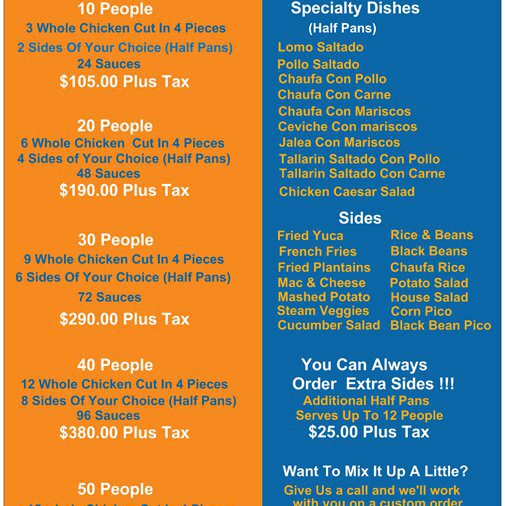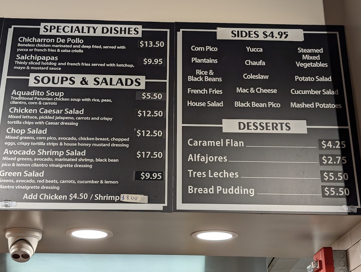 From the reviewer’s perspective, the menu at Don Pollo Of Silver Spring offers a straightforward yet satisfying selection that highlights a variety of Peruvian‑inspired comfort foods. On the SPECIALS list, standout choices like Chaufa Con Carne, Chaufa Con Pollo, Estofado De Pollo, Lomo Saltado, and Fillet De Pescado promise hearty, flavorful meals, while the MODS options such as Yellow Sauce Only, Large Sauce, and Small Sauce allow for simple customization. The Chicken section caters to groups and individuals alike with items like Fiesta For 4, Fiesta For 6, Fiesta For 8, and the Whole Chicken Solo, alongside typical extras like Bag Fee. Complementary SIDES such as Salad, Beans Only, Mac N Cheese, Potato Salad, and Steam Vegetables round out the mains, and the SOUP SALAD BOWL offerings - Chix Bowl, Chop Salad, Avocado Salad, Chix Caesar, and Aguadito - add lighter, fresher options. For beverages and sweets, choices include Water, Inka Cola 2LT, Cola Champagne, Alfajor, and Tres Leches, and the AddOns/Extra list lets you personalize your plate further with Extra Chicken, Extra Shrimp, Extra Salchipapas, Extra Seafood, and Extra Salsa Criolla. Overall, the menu balances classic comfort dishes with customizable touches that cater to both solo diners and groups.